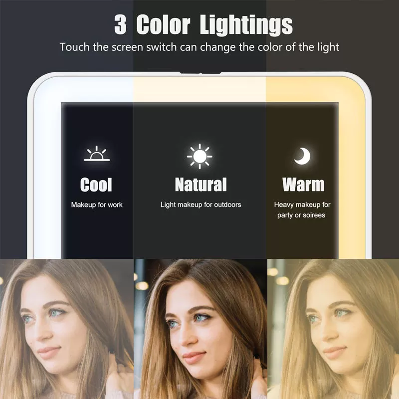 Dette bordspeilet har tre justerbare lysmoduser (kjølig, naturlig, varm) for å passe til alle sminkescenarier. Kult lys er ideelt for arbeidssminke, naturlig lys for utendørs utseende og varmt lys for kveldsbegivenheter. Den myke, flimmerfrie LED-ringen gir naturtro fargegjengivelse, og sikrer presis sminkepåføring selv i mørke omgivelser.