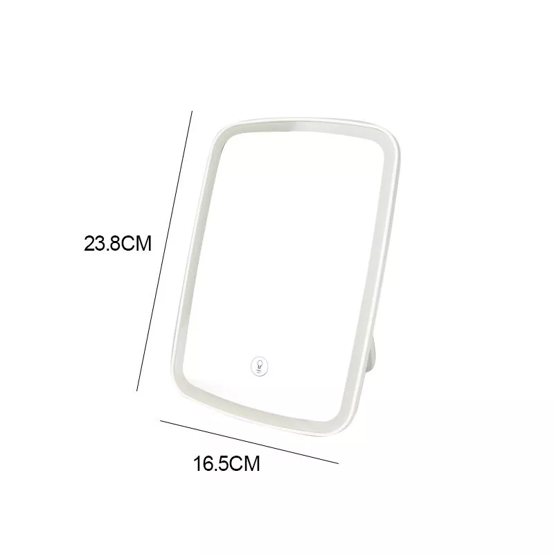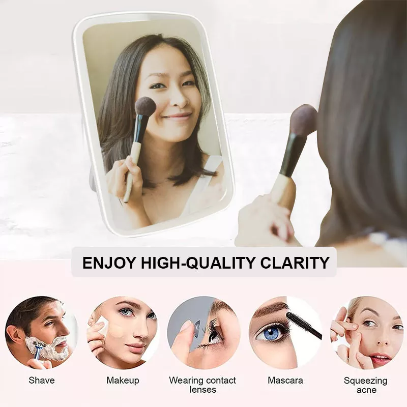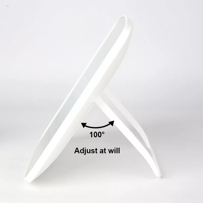 Dette bordspeilet har 3 justerbare lysmoduser (kjølig, naturlig, varm) for å matche forskjellige sminkescenarier, og leverer naturtro belysning for presis påføring. Dens 100° justerbare stativ gir fleksible visningsvinkler, mens den slanke, lette designen sikrer enkel portabilitet.
