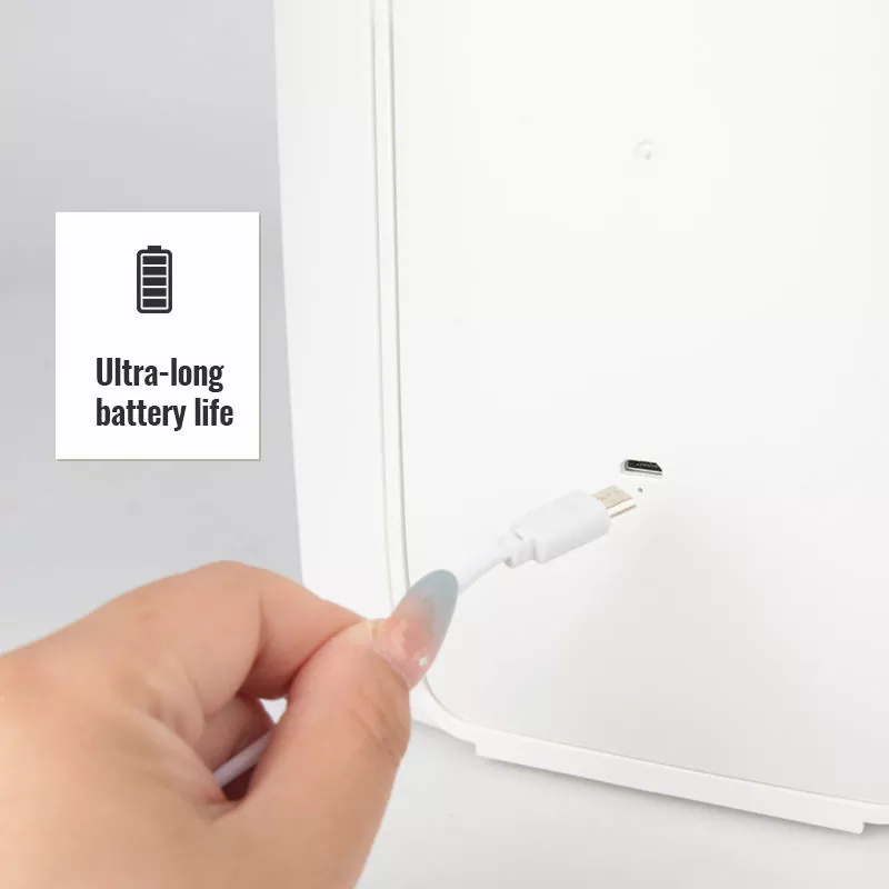 Drevet av et innebygd oppladbart batteri, støtter dette speilet USB-C hurtiglading og tilbyr ultralang batterilevetid for langvarig bruk. Ikke behov for hyppig opplading, noe som gjør den pålitelig for både daglig hjemmebruk og lange turer. Den energieffektive LED-designen reduserer også strømforbruket.